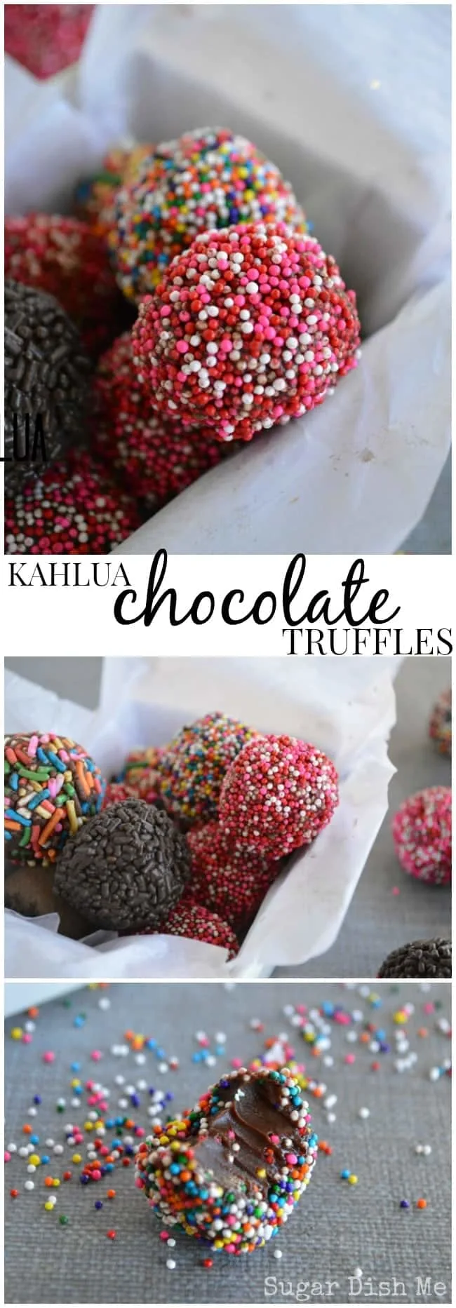 These Kahlua Chocolate Truffles are crazy easy to make. It’s pretty much like making ganache with Kahlua in place of butter, letting it chill, and then rolling into sprinkle-covered balls. Your hands WILL GET MESSY. Rolling chilled chocolate in sprinkles is going to gunk your palms up. But it’s a labor of chocolate love.