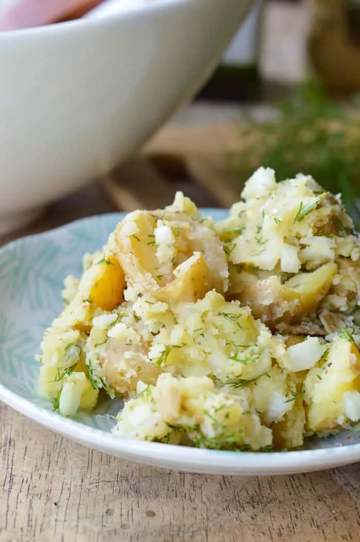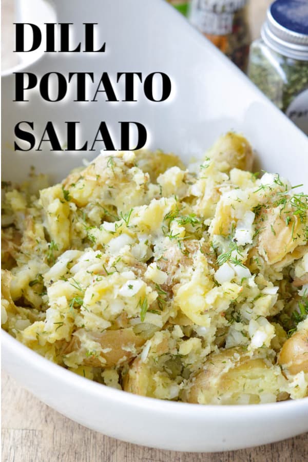 Dill Potato Salad is made with no mayonnaise but this salad is still creamy and loaded with flavor! A vinegar and mustard based dressing and lots of fresh dill make this lightened up potato salad really shine