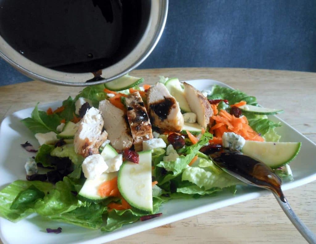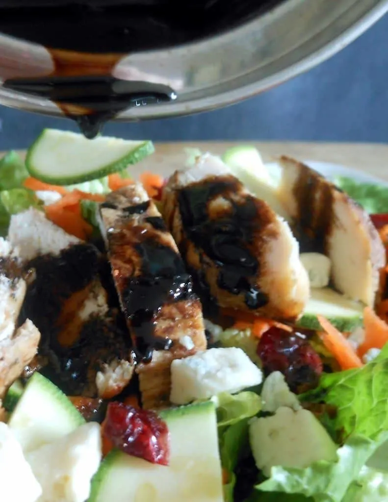 It turns into this thick, sticky, deliciously rich syrup that’s complex and sweet and works well on everything. Like this grilled chicken salad with dried berries and blue cheese. Or strawberries. Trust me on that one… serve it to guests with fresh berries and whipped cream and they’ll think you are some sort of serious gourmet when really all you did was boil vinegar.