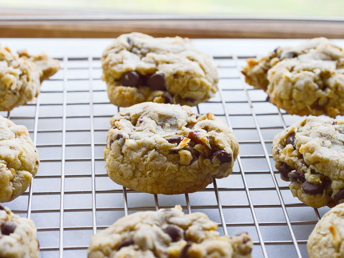 Big, thick Chocolate Chip Pecan Cookies, studded with oats and shredded coconut.