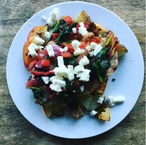 - To serve pile a handful of potatoes on each plate. Top with ¼ of the spinach mixture, then the chicken, and then top each with feta cheese!
