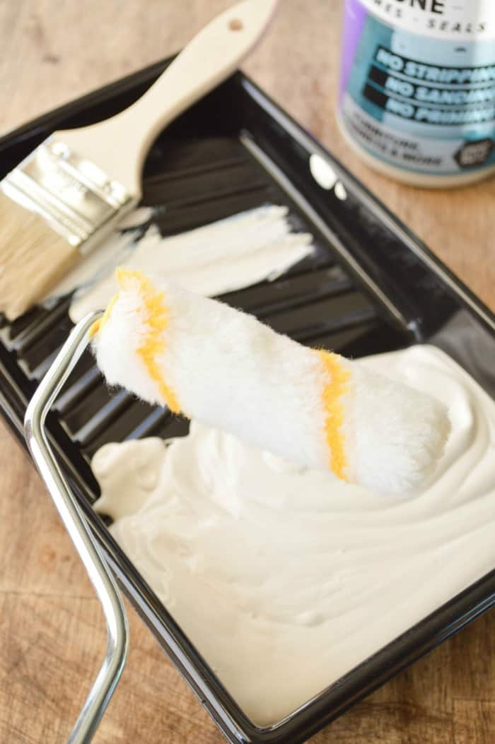 Beyond Paint’s Makeover Kit solved all of that. Everything in one box! The tray, the roller and brush, and the paint! It’s excellent for all kinds of surfaces: tile, plastic, laminate, linoleum, wood, metal, varnish, and of course, PALLET WOOD.