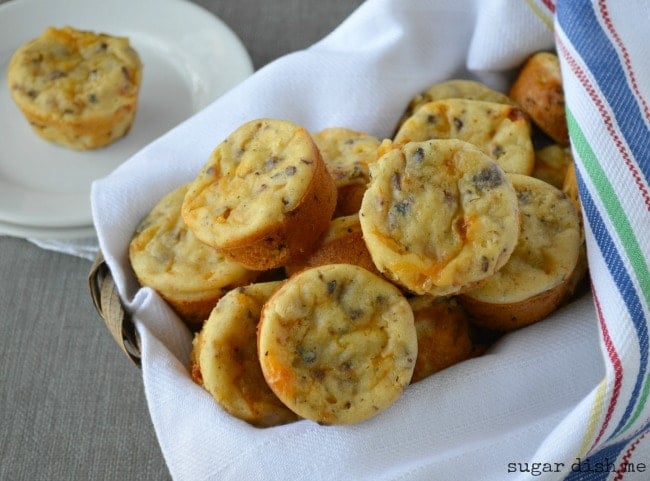These little mini-muffin sized bites are about as close as I could get to making an omelet that you can pick up and eat with your hands. There IS a standard muffin amount of flour but the rest is all garden omelet goodness with sausage, onions, bell peppers, and eggs. Savory muffins for your face.