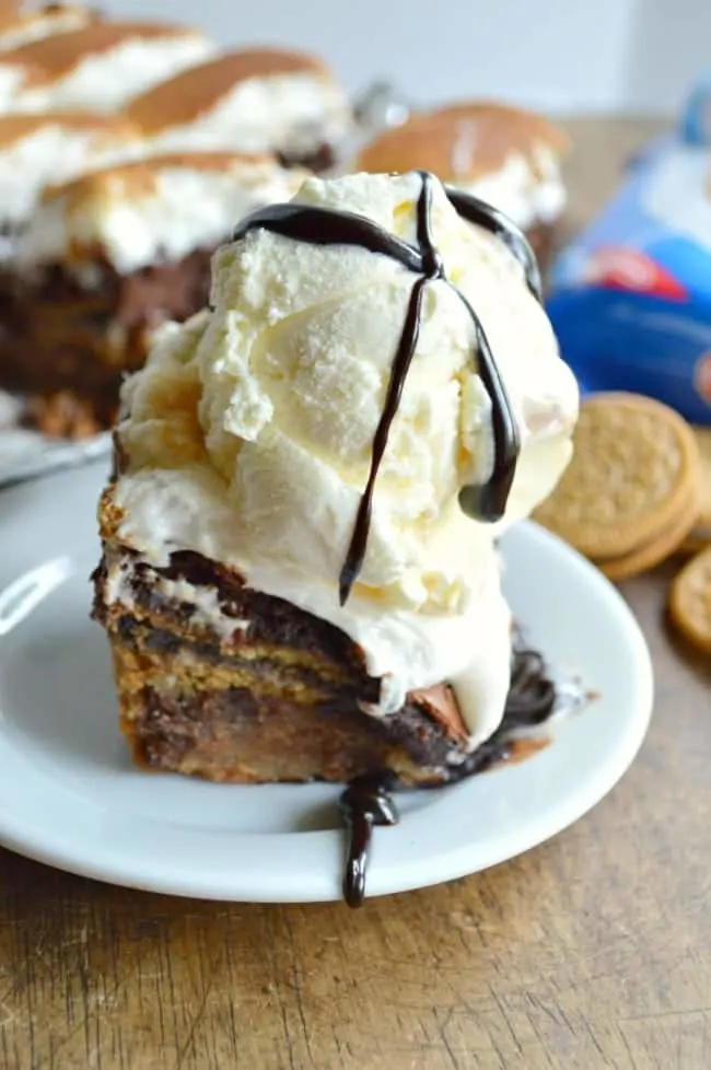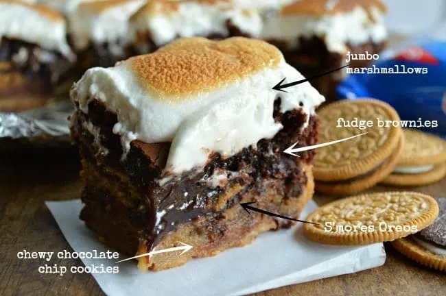 I used my favorite Chewy Salted Chocolate Chip Cookie Recipe for the base, layered in as many S’mores Oreos as I could fit in a single layer, poured in my Best Basic Brownie Recipe, and then stuck all that good stuff in the oven.